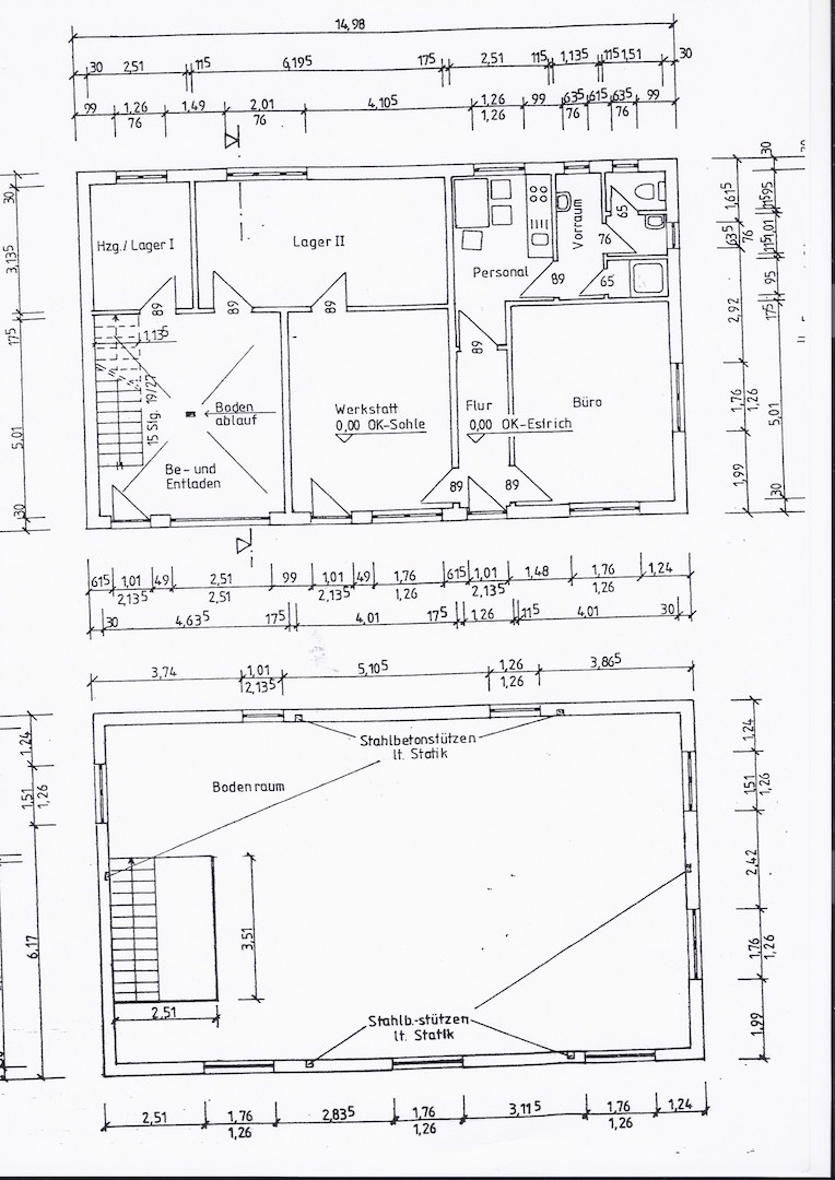 Im Erdgeschoss wird auf einer Fläche von ca. 100 qm gearbeitet. Hier befinden sich derzeit eine Werkstatt, zwei Lagerräume, ein Büro, kleiner Flur mit abgehender Küche und Toilette.